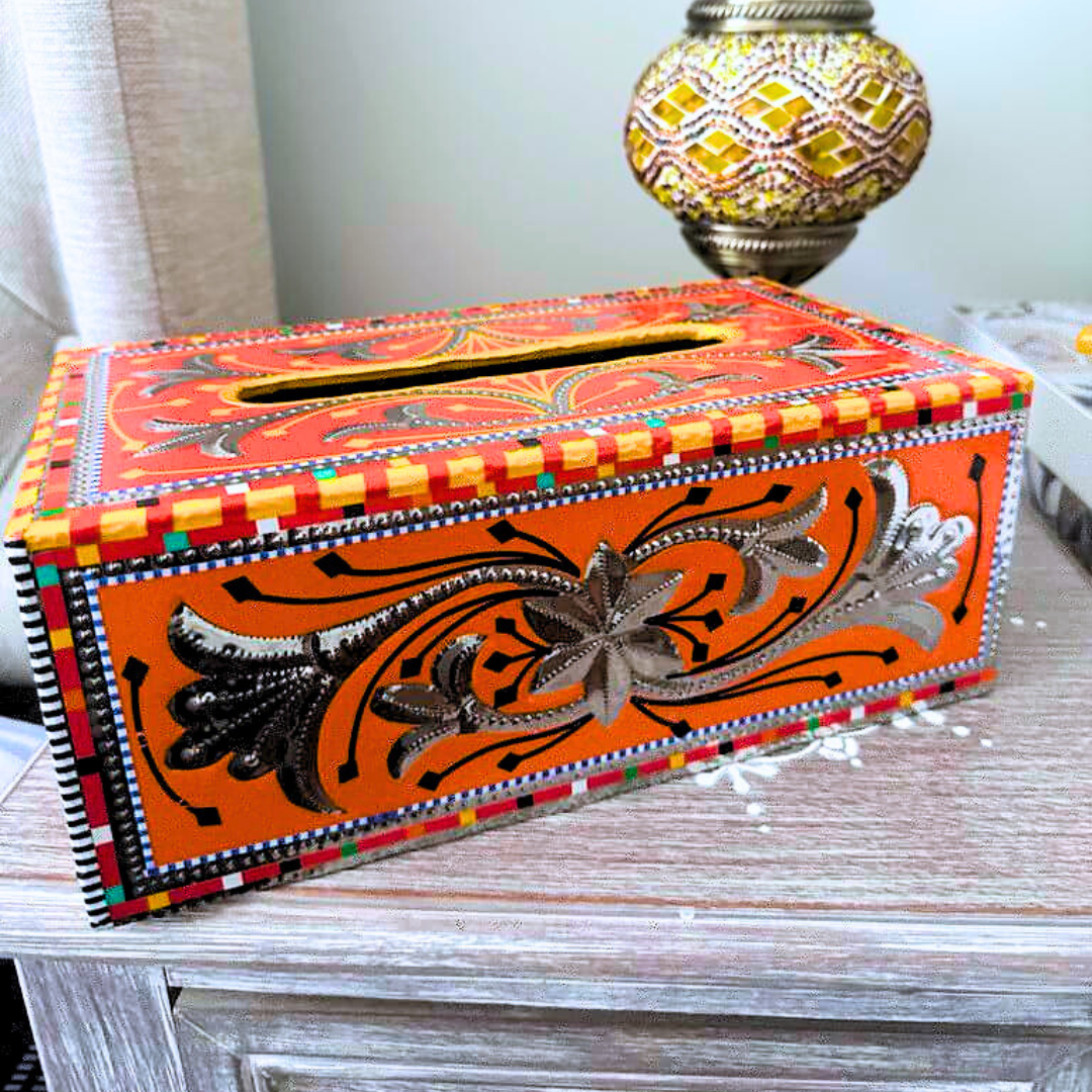 a rectangular tissue box cover in a striking Pakistani Truck Art design. This Tissue Box Holder, designed with premium quality and enduring durability, arrives in a captivating array of colors that will redefine your home decor.This Tissue Box Cover isn’t just a practical item; it’s a work of art that adds a touch of elegance to your living space